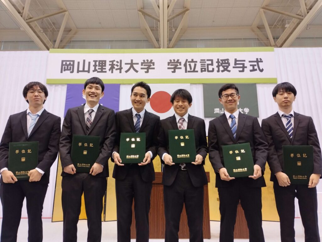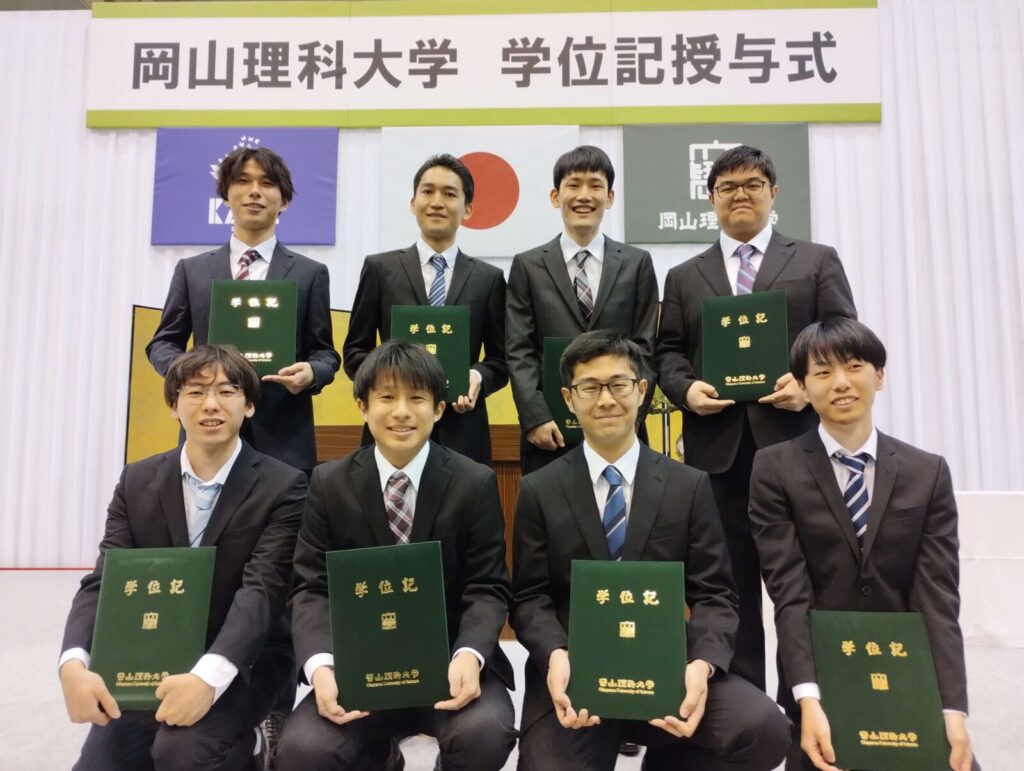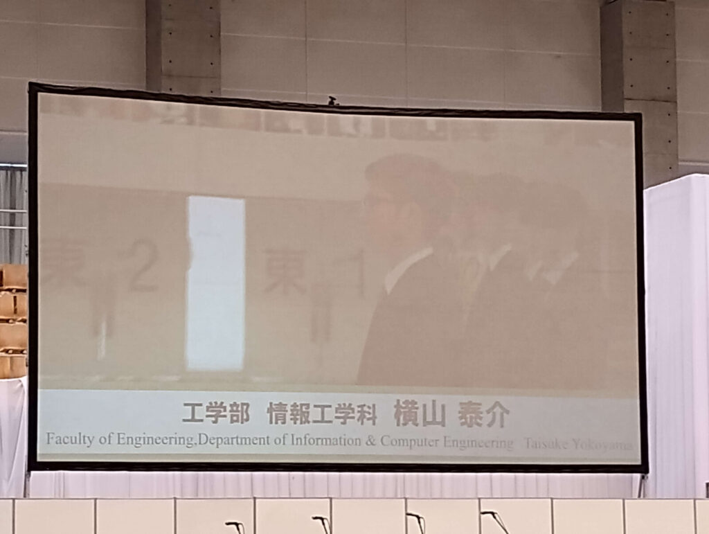 片山研究室からは学部生8名、修士2名が卒業・修了されました。片山研4年の横山さんは、工学部の卒業生(三百数十名)を代表し、ステージ上で平野学長より学位記を授与されました。ご卒業おめでとうございます。